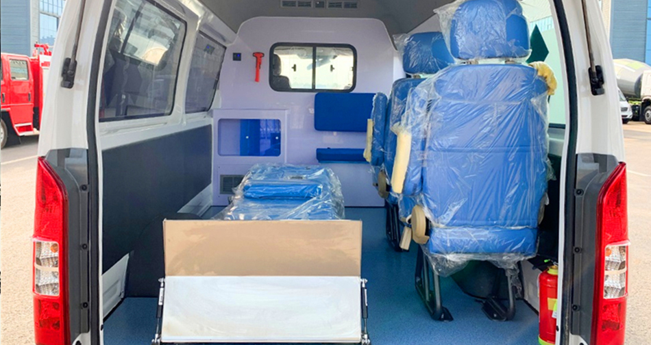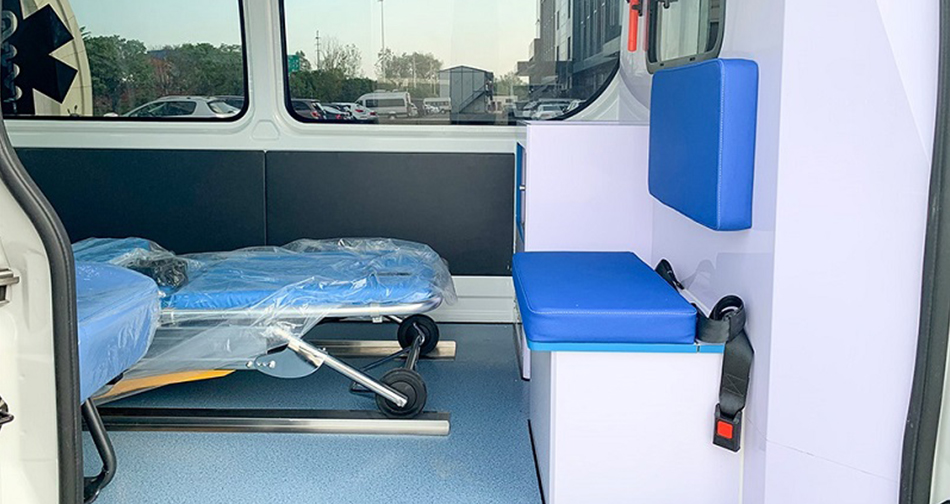 配备自动担架、铲式担架、悬挂式输液瓶夹持器等专业救护系统,操作简单且便于运输,同时采用铝合金材质,可辅助担架上车,并导向固定、防护地板。